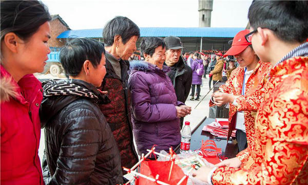多才多艺的他给大学生们现场表演了拉二胡、吹箫和空手劈鹅卵石等才艺,引得大学生们频频叫好。收到大学生送来的元宵和灯笼后,他现场书写了“学海无涯”四个大字送给学生们,并语重心长地说:“我用数码摄像机记录下了学生们表演节目的全过程,节目非常精彩,村里很需要这样健康的文化活动,今天很多每天以打麻将为娱乐活动的村民也过来看演出了。”
