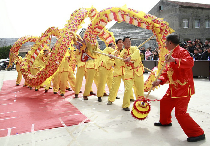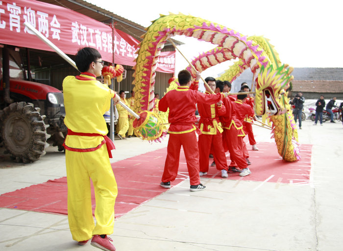 下午2:00,由大学生舞龙队和两桥村舞龙队共同上演的“双龙戏珠”舞龙表演拉开了活动的序幕,两条栩栩如生的“中国龙”欢腾跳跃,摆出“五角星”、“金元宝”、“立龙”、“龙柱”等各种造型,赢得现场村民大声叫好。