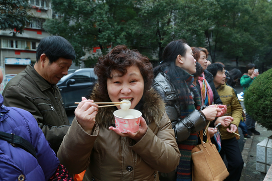 图为社区居民正高兴的品尝元宵 林典摄