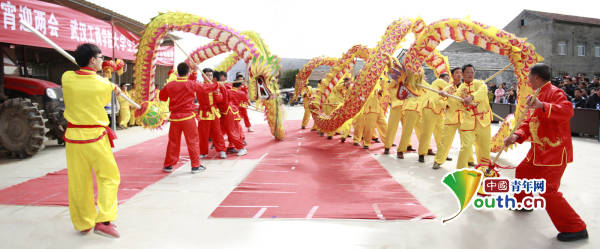 村民和大学生表演的“双龙戏珠”。中国青年网通讯员杨行摄