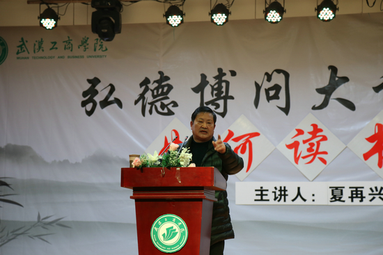 新闻中心讯(记者 李雄风 通讯员 侯小慧 特约记者 海鹏)“上大学就是来读书的,青春年华时间宝贵,最适合读书。”3月12日晚7:00,武汉工商学院特聘教授夏再兴做客弘德博问大讲坛,在该校学术报告厅为300多名学生做了一场主题为“如何读书”的讲座。该校教务部部长吴敏、团委书记吴艳、文法学院党总支书记朱威、管理学院党总支副书记陈玲等也听取了讲座。讲座由吴艳书记主持。