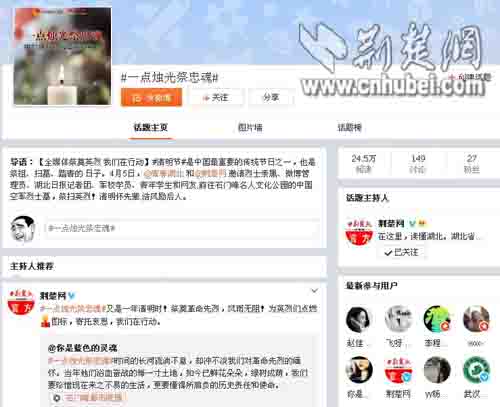 荆楚网官方微博、共青团湖北省委官方微博全程微博直播整个祭奠活动,截止记者发稿时,此次活动微博话题#一点烛光祭忠魂#阅读量已经超过20万,相关微博近200条。本次祭扫活动让青年学子们感触深刻,学生们除了在现场用实际行动缅怀先烈以外,还纷纷在微博上留言悼念。
