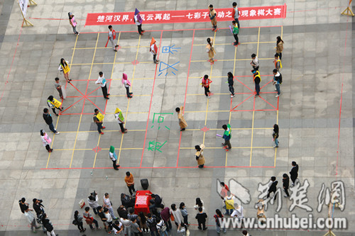 本报讯(通讯员 李雄风)4月24日中午12:20,武汉工商学院综合楼广场一场“真人象棋”比赛吸引了该校同学们的围观。进行棋艺对决的是该校督导宋善德教授与七彩节“宏观世界”象棋比赛冠军蔡盖仲同学。