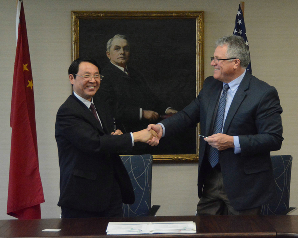 图为校长张金隆与美国威斯康星大学斯托特校区校长Robert Meyer在签约仪式上 摄影:马冬玲