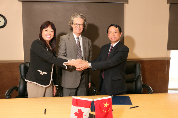 图为校长张金隆与加拿大汤姆逊大学校长Alan Shalver、副校长Baihuaz在签约仪式上 摄影:马冬玲