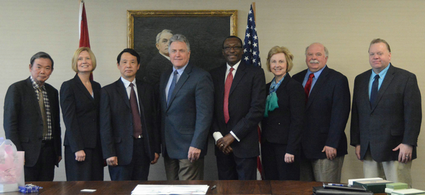 图为校长张金隆、院长张兆国与美国威斯康星大学斯托特校区校长Robert Meyer,副校长Jackie Weissenburger,