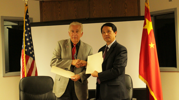 图为校长张金隆与美国威斯康星大学斯托特校区校长Robert Meyer在签约仪式上 摄影:马冬玲