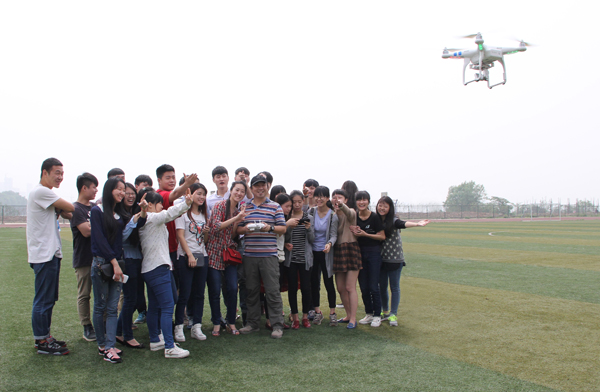 在杜平指导下,现场一些学生尝试操控了无人机。“无人机应用比较广泛,而且新颖,很多好莱坞大片的一些镜头都是运用无人机航拍,学生掌握无人机的操控和运用技巧对今后就业也有好处”。杜平说完后还利用无人机拍摄了班级集体照进行点名。