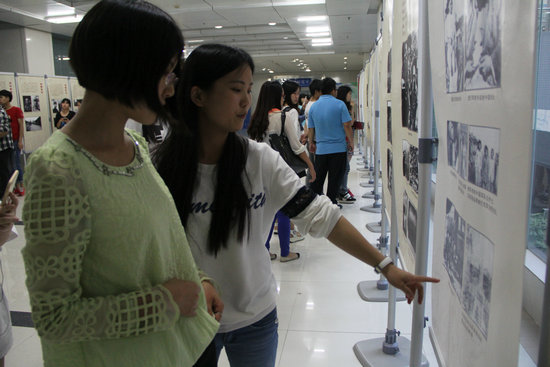 图为认真观看纪念抗日胜利的展板的同学 林典摄