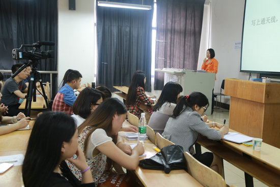 “近期李克强总理强调推动大众创业、万众创新,人民日报连篇报道各地创新创业的事迹,大家要学会使用叙述百姓故事的报道方式来反映社会主义核心价值观。”田豆豆与时俱进的分析讲解,为大家提供了新闻写作的新思路。她还介绍道,人民日报是党治国理政的重要资源和手段,其地方分社也一直坚持采取“中央精神、地方实践”的报道方针。