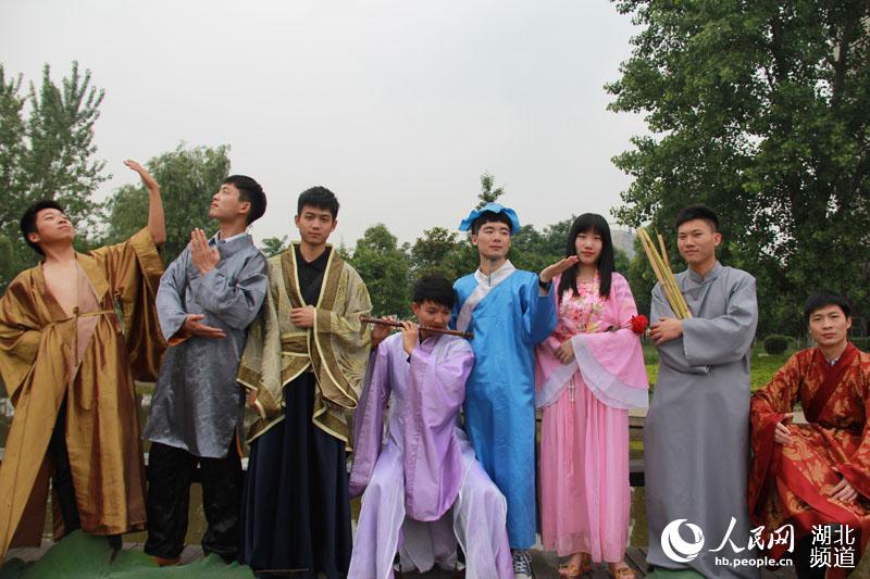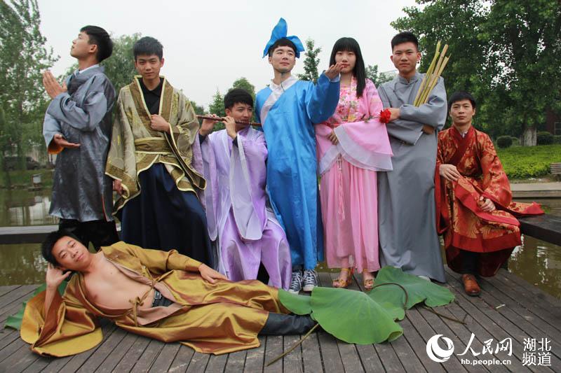 武汉5月25日电(通讯员 罗袁璐) 5月23日,在武汉工商学院静思湖桥上,该校电子商务学院8名优秀毕业生身穿古代传说中人物“八仙”的服装,手拿简易道具,摆出各种造型拍摄毕业照。