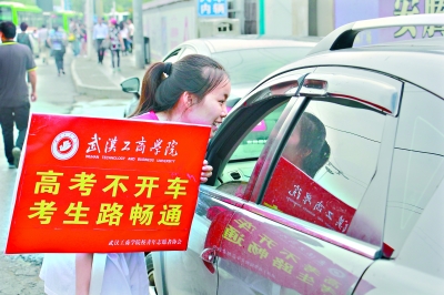 本报讯(记者黄洁莹 林敏 刘嘉)“让路高考,7、8日不开车”。6月4日,高考倒计时三天,武汉工商学院青年志愿者协会10名学生志愿者到武昌火车站与宏基客运站的十字路口,举起“让路高考”宣传牌,倡议社会车辆在高考日不开车、不鸣喇叭,保证高考期间交通畅通。