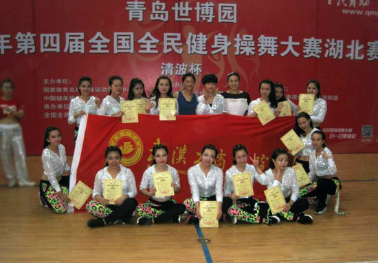 新闻中心讯(记者 韦晴)6月7日,2015年“青岛世博园”全国全民健美操舞大赛湖北赛区在武汉体育学院综合馆落下帷幕,来自全省的127支队伍参赛,由武汉工商学院公共基础课部教师吴坦和李晶带领的16名学生组成的参赛队伍在普通高校组比赛中,凭借街舞(自编动作)第一名的好成绩,荣获特等奖,获得了参加全国全民健美操舞大赛的资格,吴坦和李晶老师均被评为优秀教练员。