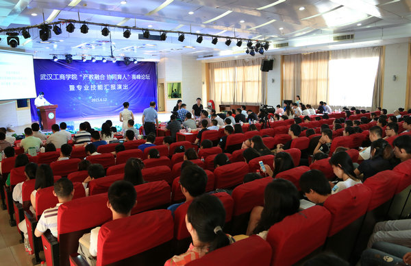 新闻中心讯(记者 李洋洋 韦晴)6月12日下午14:00,武汉工商学院 “产教融合 协同育人”高峰论坛暨专业技能汇报演出在该校学术报告厅隆重举行,用友新道科技有限公司、瑞达期货股份有限公司、武汉百捷集团股份有限公司、江苏红豆实业股份有限公司、中国石化湖北石油分公司等29家企业单位代表,武汉工商学院党委书记陈伟,副校长卢炎生,校长助理左宗文、张俊及该校管理学院院长张兆国、常务副院长李明以及相关职能部门负责人出席会议,该校300余名师生参加了本次会议。会议由该校学工部部长陈义文主持。