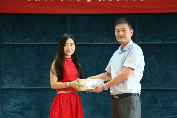 图为校友张艳华向学校赠书 摄影:刘亚婷
