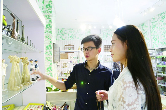 柯焱表示,因为经常和女生一起讨论手工艺品的制作,他发现具备文艺气息、独一无二的手工艺品最受女生欢迎,同时精品店装饰也采用了蔓藤绿叶、旧桌布、丝网花等自己原创的设计。