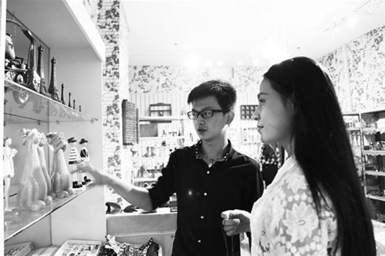 图为:柯焱(左)正在向顾客介绍店里的手工品 通讯员郑佳佳摄