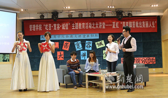 “因为失去了双手不能写字的我被迫辍学,但是我内心非常渴望学习,于是我在家自学,把字典当老师,每天练习用脚写5个生字和一个生词。”夏虹对学习的渴望和吃苦耐劳的精神深深感染了现场的同学们。一次偶然的机会,夏虹得知自己可以参加当地的残疾人运动会,她就每天早上3点起来,绕着小村庄跑步坚持了三个月,经常在练习的时候摔得头破血流,还好在自己的坚持下她最终获得了400米、800米和跳远的三项冠军,并且获得了参加全国体育比赛的资格。