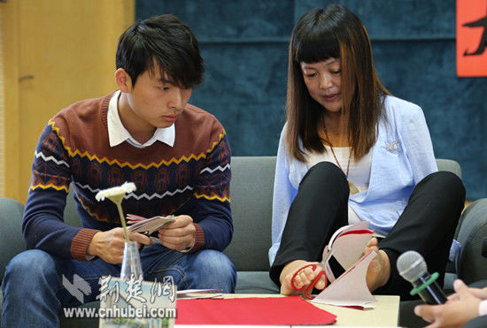 荆楚网消息(记者余梅 通讯员刘姣姣、林典)没有双臂,她却用比手更灵活的脚剪出了美丽的图案。11月6日,无臂艺术家夏虹做客武汉工商学院管理学院,为学生分享她“用双脚剪出的美丽人生”,并现场用脚教学生剪纸。
