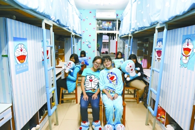 全蓝色的卡通装修风格,“哆啦A梦”的墙纸、抱枕、玩偶,还有萌萌的“哆啦A梦”睡衣、拖鞋,就连桌上的台灯、台历和粘钩都是叮当猫的卡通图像。据了解,这间寝室(如上图)由6名来自该校财务管理专业的大一女生设计、装饰而成,耗时一周,花费500余元。寝室装饰好后,不时有同学前来参观取经。