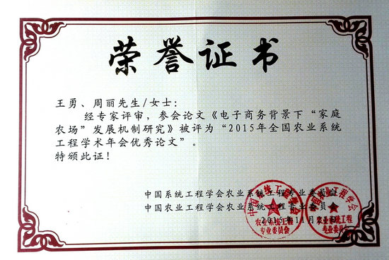 系统工程领域贾仁安等老专家通过宏观、中观和微观三个层面论述了系统工程的发展历程、应用前景、数据挖掘和数据掌握与分析。大会同时公布了2015年全国农业系统工程学术年会优秀学术论文结果,王勇副教授和周丽老师的参会论文《电子商务背景下“家庭农场”发展机制研究》榜上有名。