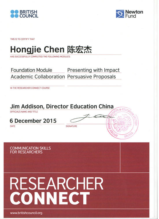 新闻中心讯(通讯员 德芳)日前,记者从武汉工商学院教师发展中心获悉,2015年12月4日—6日,武汉工商学院青年教师陈宏杰博士应邀参加了湖北省科技厅与英国大使馆在武汉联合开展的“研究人员国际沟通力提升培训班(Researcher Connect)”,圆满完成各项课程的学习,获得由英国文化协会颁发的“结业证书”。