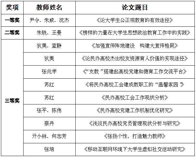 据了解,此次会议共有全省35所民办高校、独立学院的党委书记、副书记、有关职能部门负责人近200人参加。经专家委员会严格评审、遴选,并报湖北省委高校工委组织处、湖北省委高校工委思想政治教育与社会科学研究处批准,共评选出90篇优秀论文,其中特等奖6篇、一等奖12篇、二等奖24篇、三等奖48篇。