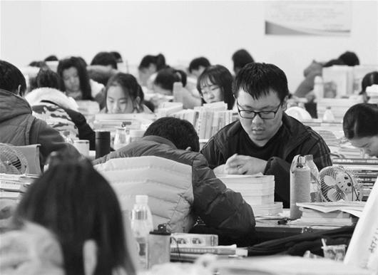 楚天金报讯(记者宋锐 通讯员林典摄影报道)随着2016年全国硕士研究生入学考试的临近,不少大四学生已进入最紧张的冲刺阶段,以“高考模式”迎战研考。在武汉工商学院专门为考研学生准备的自习室中,每天早上7时半到晚上10时半,都能看到爆满的人群和成堆的书海。
