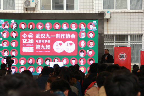 新闻中心讯(记者 罗袁璐)12月30日下午2:00,由九一创作协会和湖北省包装联合会主办,武汉工商学院艺术与设计学院承办的“12.30等您(武汉城市合伙人设计师篇)”暨九一创作协会月度分享(第九场),在武汉工商学院艺术楼一楼中国文化创意产业研究中心隆重开幕。武汉工商学院党委书记陈伟、艺术与设计学院院长许开强,九一创作协会执行会长郭恒斌,武汉新帝广告有限公司CEO姚道刚等知名学者和业界精英,以及武汉工商学院艺术与设计学院的全体师生参加了此次活动。