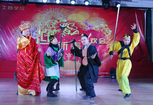 晚会最幽默搞笑的节目当属校宣传策划部带来的小品《西游天团迎评估》,作为本次联欢会唯一的小品节目,演绎了唐僧师徒四人迎接佛祖评估的离奇故事,其中既穿插了唯美的爱情故事和令人爆笑的搞怪情节,又呼应了学校即将迎接本科教学合格评估的主题。小品中,啰嗦秀逗的唐僧、活泼可爱的大圣、好色贪吃的二师兄、真诚淳朴的沙师弟,还有勇敢追求爱情的白骨精无不让人眼前一亮,其中该部门王庆老师扮演的猪八戒一角,可谓将二师兄的好色、贪吃性格演绎得淋漓尽致,令观众捧腹大笑。