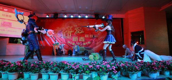艺术与设计学院分工会带来的真人版《英雄联盟》让人眼界大开、脑洞大开,85后年轻老师们穿上英雄联盟游戏中的服装,拿上道具,来了一场真实的英雄大战,瑞雯、蔚、女警、EZ等广为人知的英雄一一登场,各种游戏中的战斗场景一一展现,给人一种真实与虚拟混合的感觉,引得现场尖叫不断。