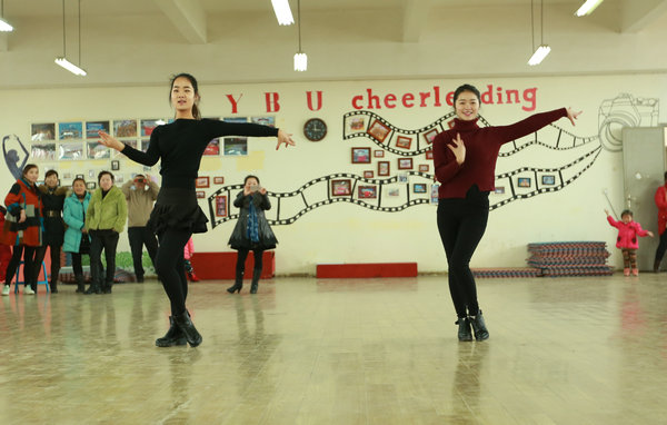 武汉工商学院啦啦队队员正在为大妈们示范拉丁舞 摄影:王铖焱