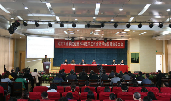 新闻中心讯(记者 万风 小璐)3月3日下午14:30,武汉工商学院迎接本科教学工作合格评估誓师动员大会在该校学术报告厅隆重召开。该校董事长彭秀春,校长张金隆,党委书记陈伟,副校长卢炎生、桂裕清,党委副书记孙松发,特聘教授夏再兴,校长助理左宗文、张俊、王程军,以及各二级学院院长、常务副院长、党总支书记(副书记)、系主任(副主任)、骨干教师、学术带头人、专业带头人、教师代表、学生代表,各职能部门科级以上人员和科员代表共400余人参会。陈伟书记主持了会议。