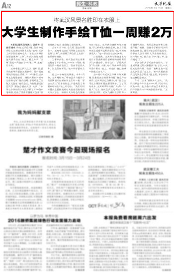 经过一个寒假的调整,今年2月份,王寓尊得知了该校艺术与设计学院品牌设计创新班学生们有一批“手绘大武汉”的手绘作品,于是萌发了将图案印制在T恤上的想法。“我们的目标受众主要就是针对来自全国各地的武汉大学生,将具有武汉特色的图案印在T恤上,这样我们就拥有地方特色,可以形成地方独特品牌。况且目前市面上还没有这种类型的T恤,市场应该很大!”这一想法让他信心满满。