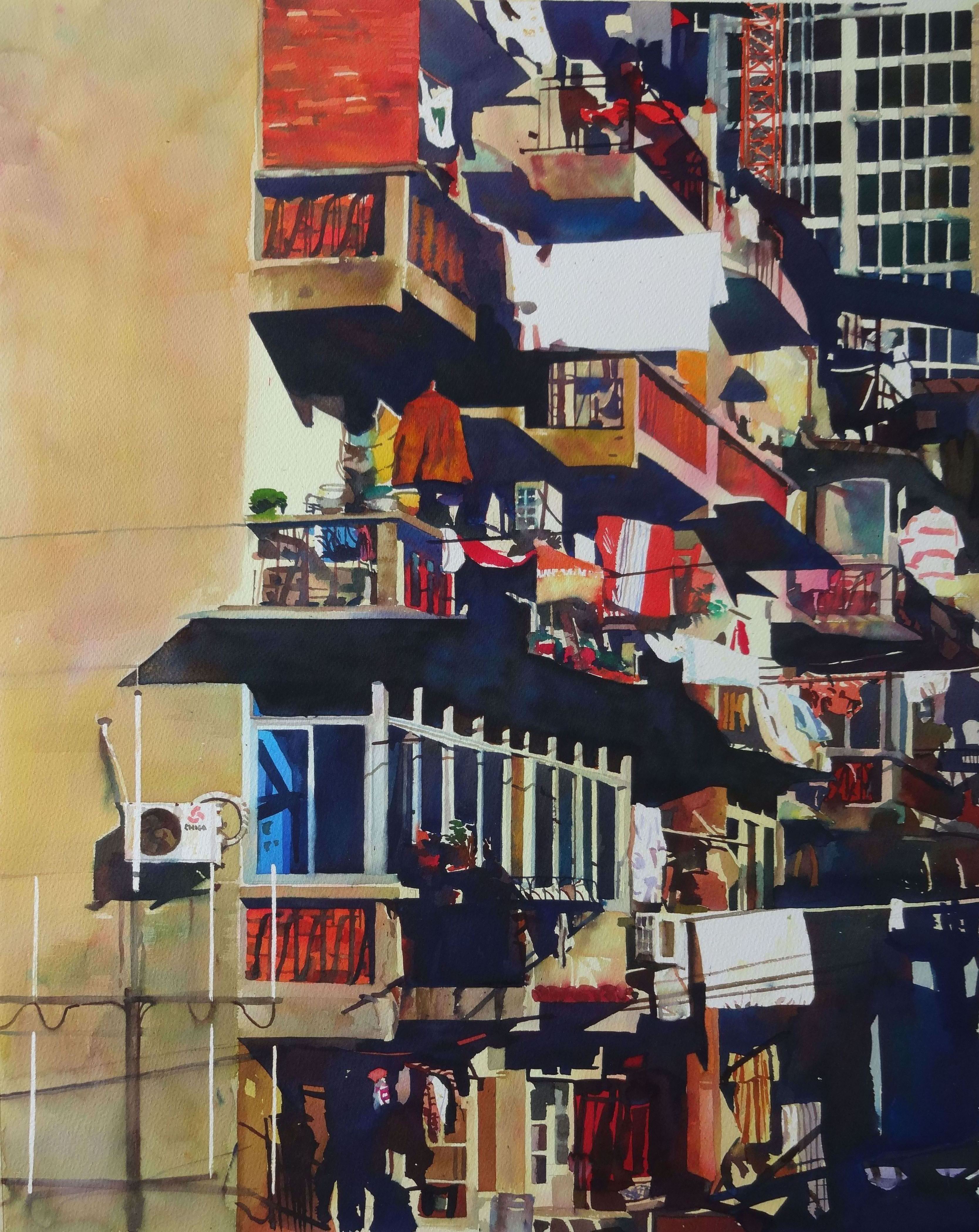 周全老师介绍,《市井2号》这一作品展现的是阳光下的居民楼一角,采取的是传统的透明水彩的画法,写实风格,着重表现了阳光照射在居民楼上的五彩缤纷的感觉。那些阳台上堆放的杂物,那些晾晒着的衣物和被褥,那些并不统一的门窗和管线,无不散发着一种生活化、自然化的气息。“从这些普通的市井生活画面中我能够感受到强烈的生命力,能够体会到普通人的酸甜苦辣,所以我产生了强烈表达它的欲望。”周老师如此介绍创作这个作品的初衷。