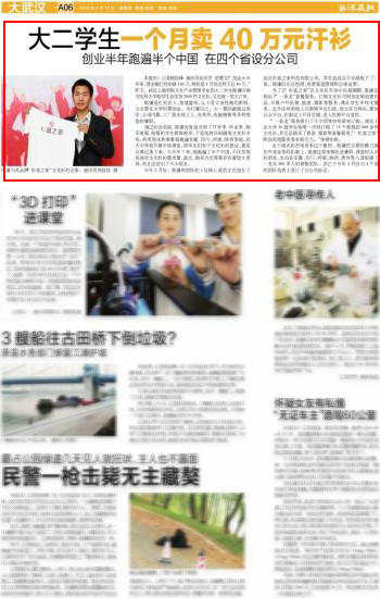 武汉晨报讯(记者 杨佳峰 通讯员 吴田芳 范博文)“创业大半年来,营业额已经突破100万,特别是3月份达到了近40万。”昨天,武汉工商学院文化产业管理专业的大二学生陈谦向南方医科大学校学生会发货2000件文化衫,又完成一笔大订单。