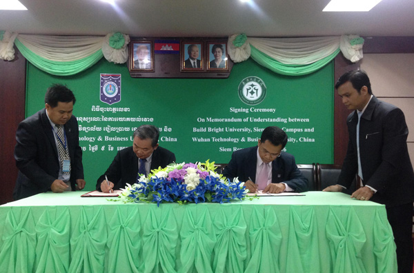 4月6日,张兆国一行访问了智慧大学暹粒校区,并受到该校校长Phann Keara 、教务部副主任Nguon Rothsophal及其他部门负责人的热情接待。该校的教师与管理人员主要由留学西方的回国人员组成,全英文教学是其特色之一。目前学校拥有10个校区,在校生超过30000人,对学生实施学分制管理,具有学士、硕士、博士授予权。目前该校已开设部分泰语课程、日语课程。双方经过友好洽谈,达成了合作意向:第一,加强两校的文化交流与合作,使两校的合作成为中柬友谊的桥梁;第二,加强两校学术方面的交流,互派教师和留学生,合作办学;第三,武汉工商学院为柬埔寨智慧大学暹粒校区的教师和学生提供汉语文化学习和交流的平台。随后,两校领导正式签署了合作备忘录。