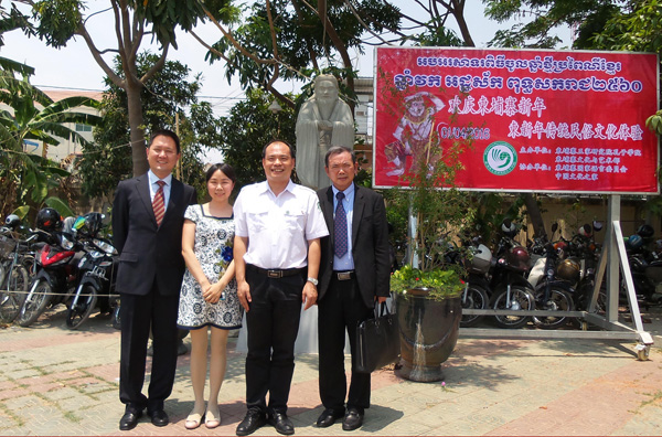管理学院张兆国院长、李明副院长、马冬玲院长助理与柬埔寨王家研院孔子学院中方院长帅式毅在孔子学院孔子雕像前合影 摄影:马冬玲
