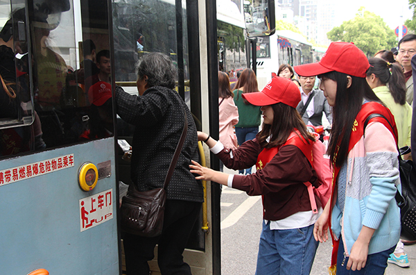 新闻中心讯 (记者 洪苗苗 摄影 柯希轩) “大家注意安全,请让老人和小孩先上车,保持秩序。”4月16日下午3:00,在武汉光谷珞喻路鲁巷公交车站站点,武汉工商学院新闻专业大一学生黄倩一边维持乘客上车秩序,一边搀扶着一位老人上车。原来,这是该校思政课部组织的社会实践小分队正在开展志愿服务活动。