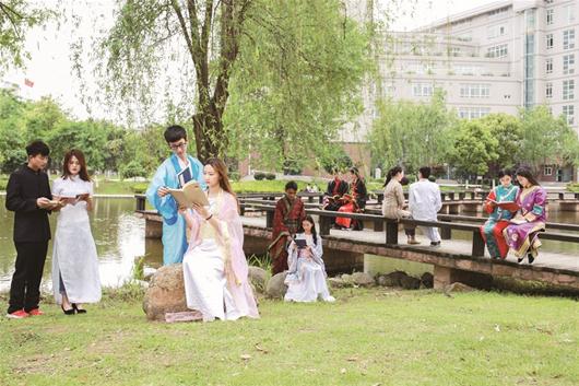 楚天都市报讯(记者 周治涛 通讯员 林倩 何育钦 摄影 王铖焱)人间四月好读书,19日下午,武汉工商学院物流学院12名身着汉、唐、宋、明、清和民国6个不同时期服饰的大学生,手捧《史记》、《唐诗宋词》、《弟子规》等国学书籍,在该校静思湖旁朗诵。据介绍,穿各朝服饰读古典书籍是学校“诵古韵、传经典”古诗词朗诵比赛的环节之一,借此呼吁学生放下手机,阅读经典书籍。