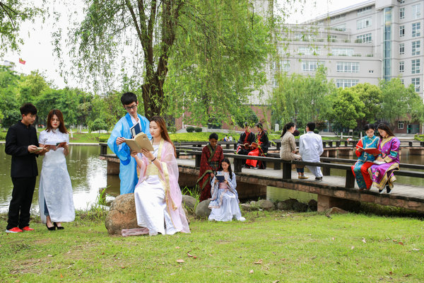 本网讯(通讯员 林倩 何育钦 摄影 王铖焱)4月19日下午,武汉工商学院12名身着汉、唐、宋、清、明和民国6个不同时期服饰的大学生,手捧《史记》、《唐诗宋词》、《弟子规》等国学书籍,在该校静思湖旁热烈交流,形成一道亮丽的风景线,引来不少人前来围观。