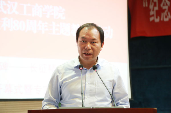 新闻中心讯 (记者 吴田芳 张瑞 洪苗苗)4月21日下午2:30,“纪念长征胜利80周年”主题教育活动开幕式暨“永远的丰碑——长征精神永放光辉”讲座在武汉工商学院学术报告厅隆重举行。武汉轻工大学原财务处退休高级会计师沈仁葆,武汉工商学院党委书记陈伟、党委副书记孙松发,以及该校相关职能部门负责人、各学院党总支书记、分团委书记、辅导员、学生会,分团委负责人、学生社团负责人、学生党员、入党积极分子代表共400余人参加此次活动。活动由该校学工部部长陈义文主持。