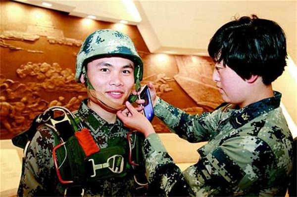图为:背上伞兵背包,戴上伞兵头盔,应征大学生﹙左﹚俨然是一名空降兵战士。