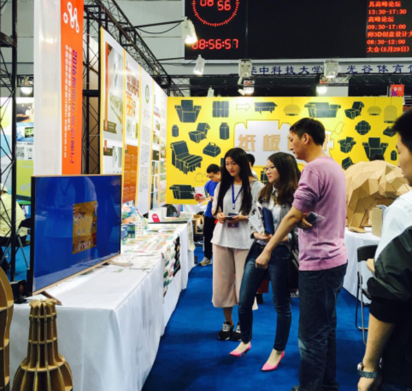湖北教育新闻网讯(特约记者 丁真)5月28日,由武汉·中国光谷创客联盟、中国创客空间联盟主办的2016首届东湖创客汇暨中国创客联盟启动仪式在武汉光谷体育馆盛大开幕,省科技厅副厅长刘望清出席活动。来自国内外的创客团队们携带1000余件创新产品与市民见面。武汉工商学院艺术与设计学院创意品牌工坊的师生们带着自己的创意设计产品参加了本次活动,展品分为《武汉能》、《食色江城》、《庭院》、《醉奥运》、《甍》五个系列,包括创意地图、手机壳、明信片、动画视频等上百种不同的展品。