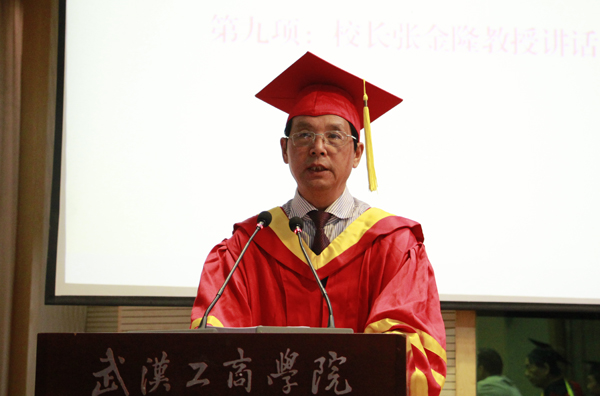 随后,张金隆校长在毕业典礼上发表了意味深长的讲话,他代表学校向全体毕业生表示热烈的祝贺,向辛勤工作、无私奉献的老师和家长们表示衷心的感谢和崇高的敬意。他深情地说:“同学们,你们来到武汉工商学院学习知识、增长才干、陶冶情操、塑造自我,共同度过了你们人生成长过程中最为灿烂的青春年华。现在,你们中有的同学拿到了进一步深造的录取通知书;有的同学拿到了就业聘用合同;有的同学选择创业并拿到了人生的第一桶金……但这一切仅仅是迈开了人生的第一步,未来的道路必将漫长而充满挑战。”
