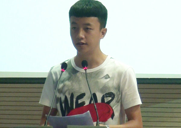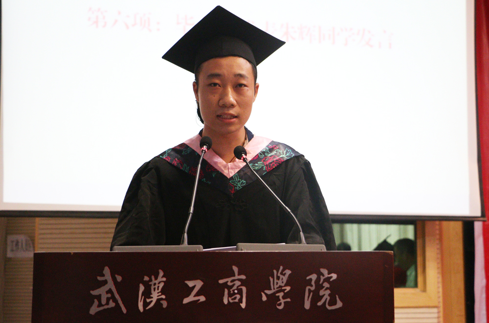 电子商务学院市场营销专业应届毕业生朱辉代表毕业生发言。他向大家分享了自己充实而又难忘的大学时光,并对学校、老师、同学表达了真挚的感谢。大学四年朱辉做过各种兼职,与他人合伙开过餐厅,担任过学生会主席,获得过“校三好学生”等多个奖项。在讲话中,他感慨地说:“在学校,我们学会了分析与思考,学会了合作与竞争,学会了借鉴与比较,学会了如何不断超越、突破自己的极限。同时,学校领导、老师也给予我们无微不至的关怀和耐心的指导。四年的大学生活完美落幕,我将永远将这份回忆存留在心中。趁着年轻,我们将努力追逐梦想,实现自己的人生价值。”