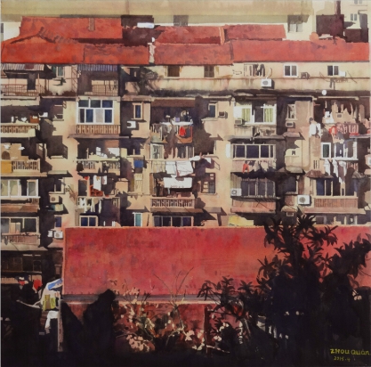 据周全老师介绍,《市井1号》这一作品展现的是自己日常生活的环境——“市井”,描绘的是阳光下的居民楼一角,采取传统的透明水彩的画法,画面丰富,展现了阳光照射在居民楼上的五彩缤纷的感觉。“从这些普通的市井生活画面中我能够感受到强烈的生命力,能够体会到普通人的酸甜苦辣,所以我产生了强烈表达它的欲望。”周全老师说道。
