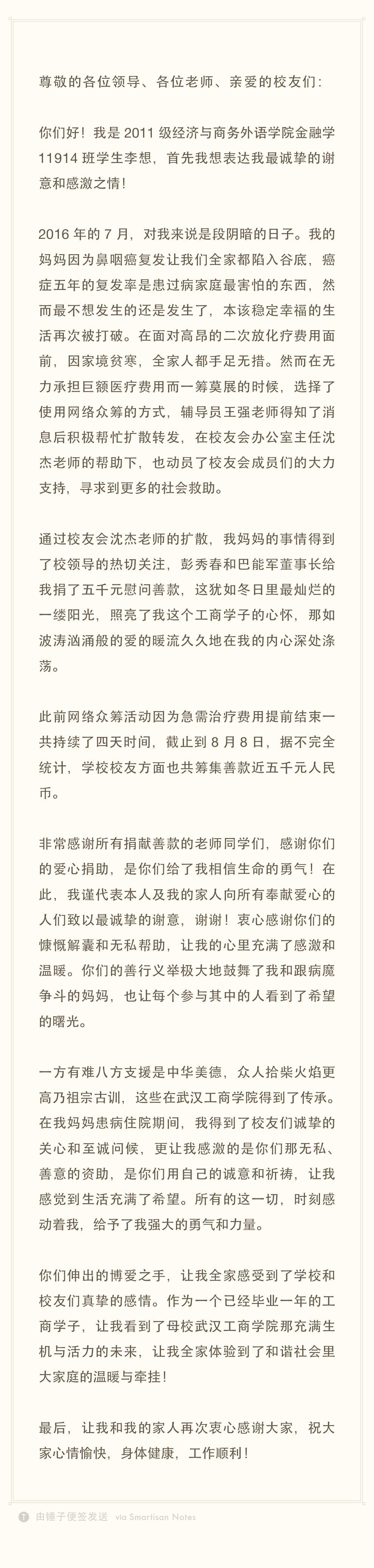 新闻中心讯(记者 周帆 通讯员 沈杰)“谢谢母校的校领导和师生们的帮助和关心,让我充满信心和勇气能够陪同母亲继续与病魔作斗争。”近日,武汉工商学院校友会办公室收到了一封感谢信。原来这是该校金融专业2015届毕业生李想为了感谢学校董事长彭秀春以及师生爱心捐赠的万元善款而写的一封信。