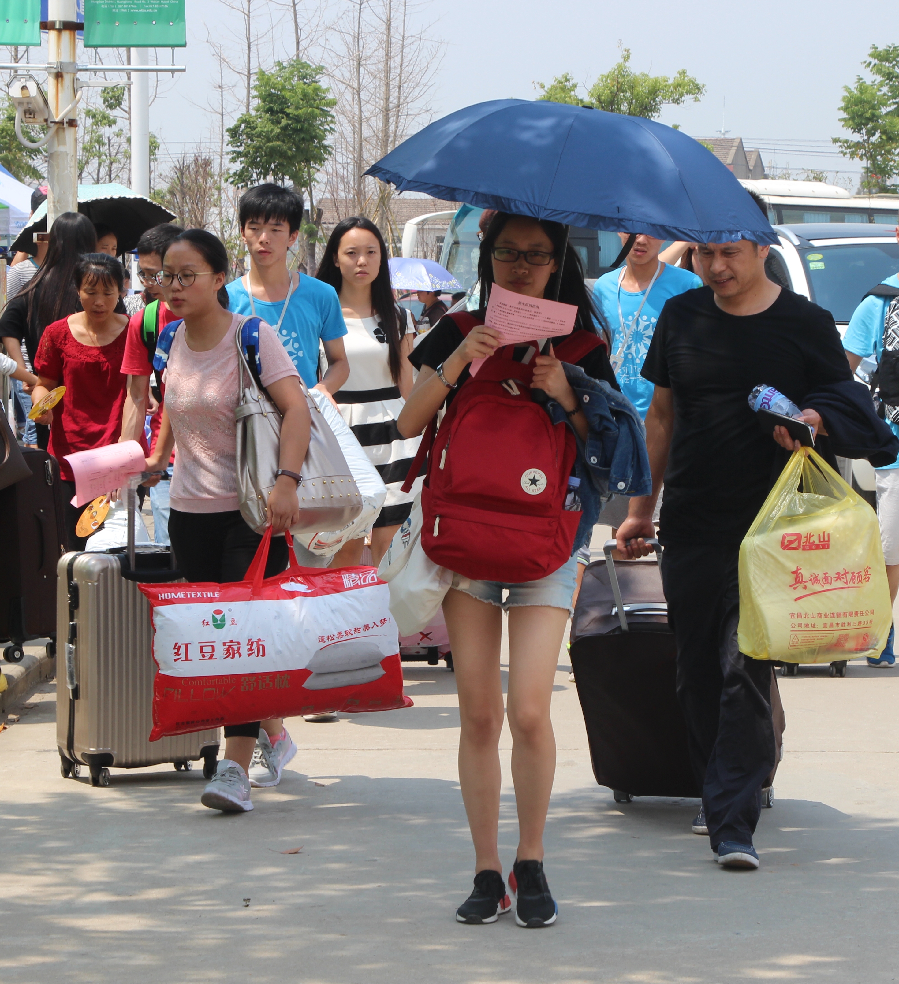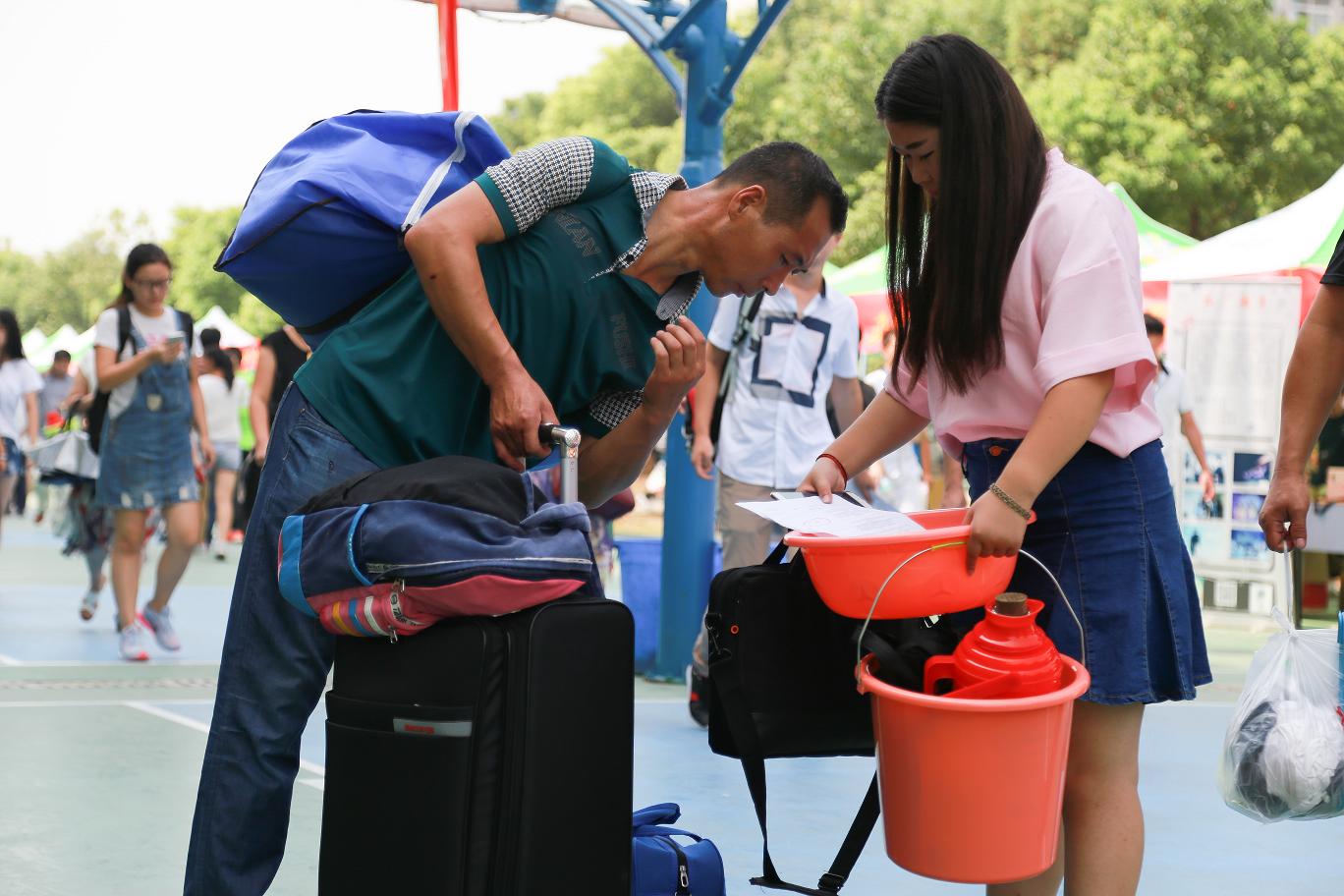 志愿者与新生家长进校