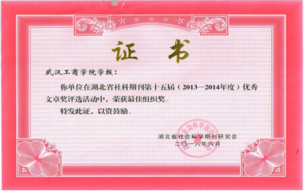 此外,在本次评选中,共有武汉大学学报(人文版、哲社版)、华中科技大学(管理学报)、武汉工商学院学报等27家期刊单位被授予优秀文章评选活动最佳组织奖,武汉工商学院学报也是湖北省内民办院校中唯一获此奖项的单位。武汉工商学院科研部部长刘春表示,本次获奖展示了武汉工商学院学报的办刊水平和学校青年教师的学术水平,提升了武汉工商学院学报在省内外的知名度。